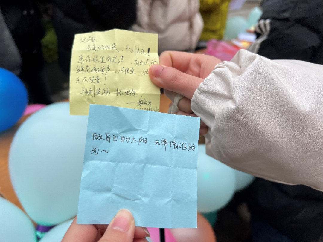“送你一份礼物,请你品尝一杯奶茶,帮你领取一份快递”每一张写满祝福的便利贴,都承载着男生们对女生的深情与关怀,字里行间,流淌着最真挚的情感。