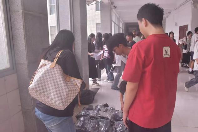 团学会干部和各班班导为新生发放军训服装,并提醒新生做好开学典礼准备工作。