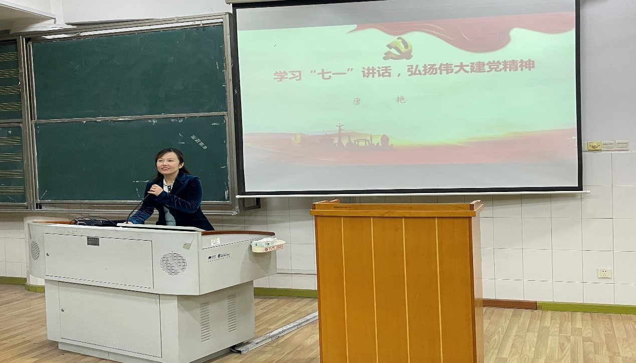 课程开始,唐艳首先发起提问:“什么是‘七一’讲话?”,随后向同学们介绍“七一讲话”的由来及重要意义:“七一”讲话是习近平总书记在庆祝中国共产党成立一百周年时发表的重要讲话。“七一”讲话精神精辟概括了宏大的建党精神,科学指明了以史为鉴、开创未来的目标方向。紧接着,唐艳紧紧围绕学习习近平总书记“七一”重要讲话精神这个重点,从“把握讲话精神丰富内涵”、“领会讲话精神重大意义”、“回顾中国共产党百年奋斗的光辉历程”、“实现中华民族伟大复兴取得的四个伟大成就”、“新的征程上我们坚持做到九个必须”等五个方面展开讲述,要求同学们学好党史,不忘初心,牢记使命,缅怀革命先烈,传承红色精神。最后,唐艳鼓励同学们向优秀共产党员看齐,自觉做到弘扬光荣传统、赓续红色血脉,并把伟大建党精神继承下去、发扬光大!