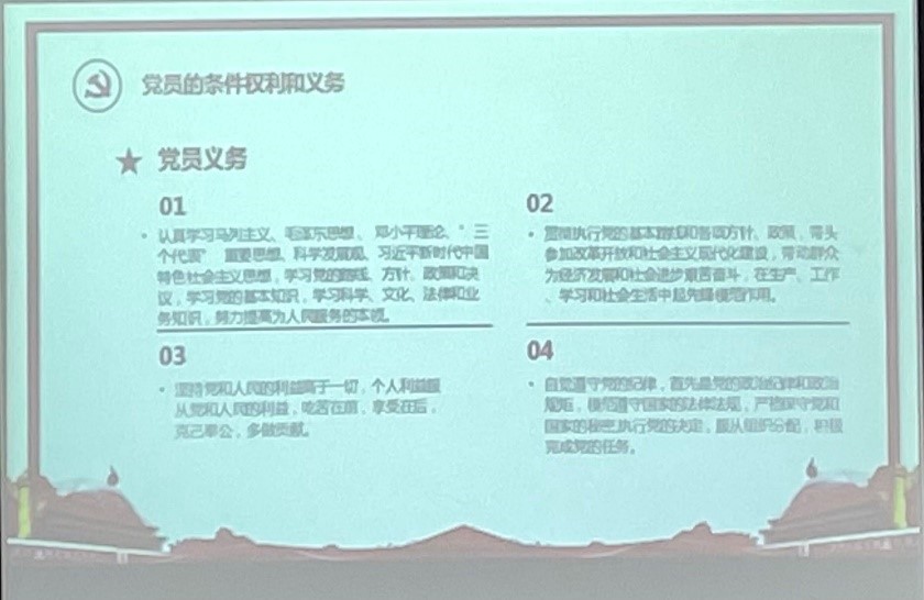 随后,蒋老师围绕中国共产党的性质及其根本宗旨,党员的条件、权利和义务以及如何以实际行动争取早日入党这三方面分别为同学们进行了讲解。蒋老师强调,百年来,中国共产党之所以能够迎难而上,蓬勃发展,成为中国的执政党,正是因为始终坚持党的性质和宗旨,坚持以人民为中心,坚持正确的政策和模范的行动,赢得了最大多数中国人的拥护和支持。同时,蒋老师认为作为一名党员,不应只关注个人私利,而应积极履行党员义务;不应止步于理论学习,更要注重在实际行动中践行真理。