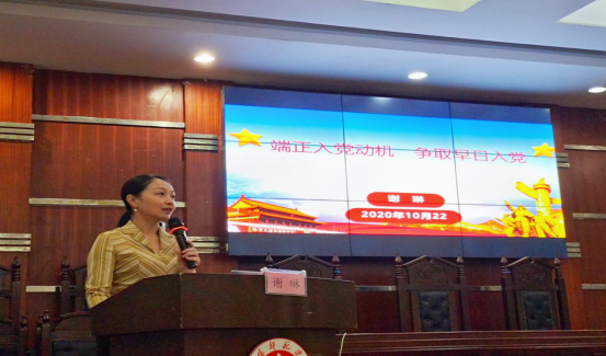 2020年10月22日晚上七点半,公司于东校区模拟法庭举行了第61期入党积极分子培训第四讲——端正入党动机,争取早日入党。本次培训是由法公司党总支副书记谢琳同志担任主讲人。