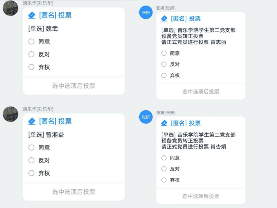 通过正式党员们的无记名线上投票表决,大家一致认为刘睿、肖杏娟等10名预备党员具备了转为正式党员的条件和思想觉悟,因此同意按期转为正式党员。并希望他们能坚持不懈,严格要求自己,做好党员的模范带头作用。