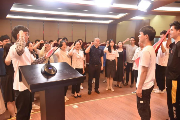 会议第五项,由公司党总支副书记陈雅斐同志为此次发展的预备党员颁发党徽,之后,在员工第二党支部党员黄烽同志的带领下举起右手庄严宣誓,与会的其他党员重温入党誓词。